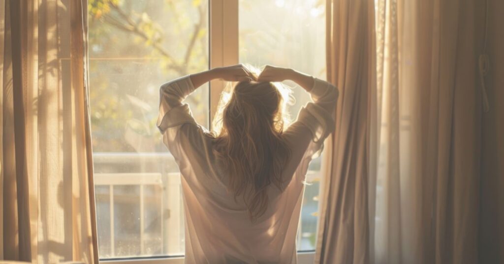 朝起きたらまずカーテンを開けて日光を浴び、背すじを伸ばして深呼吸。